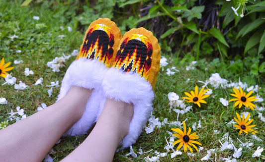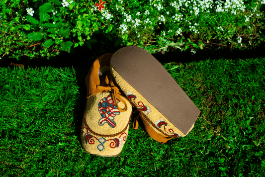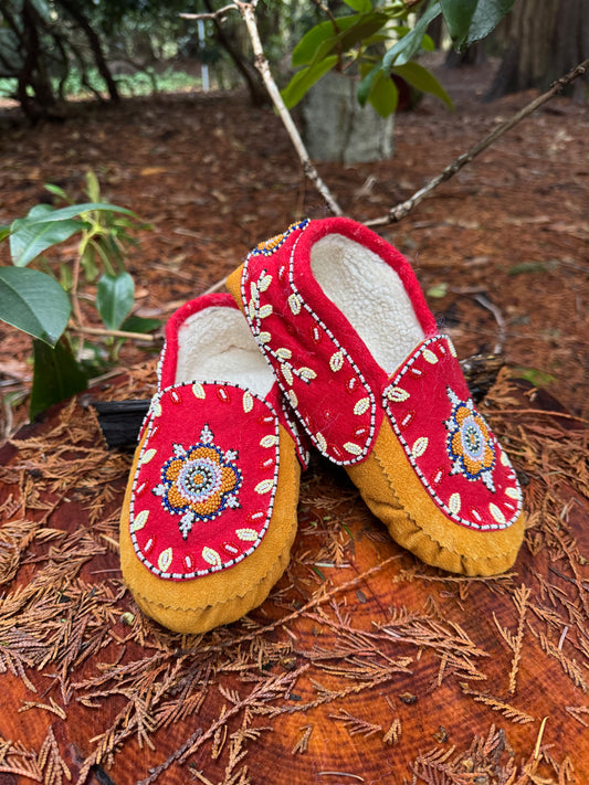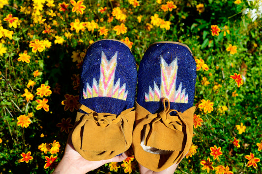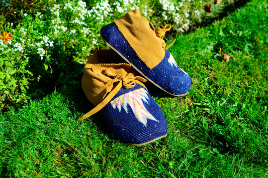 We offer beaded moccasins for adults, children, and all ages with custom beads. Each pair is completely made by hand and is made with native inspiration. Handcrafted with perfection, each pair requires Around 4 hours of work. Around 2 hours spent on beadwork and 2 hours on cutting, shaping, etc. Moccasin patterns and bead designs are completely bespoke. Each stitch and bead has its own intent.