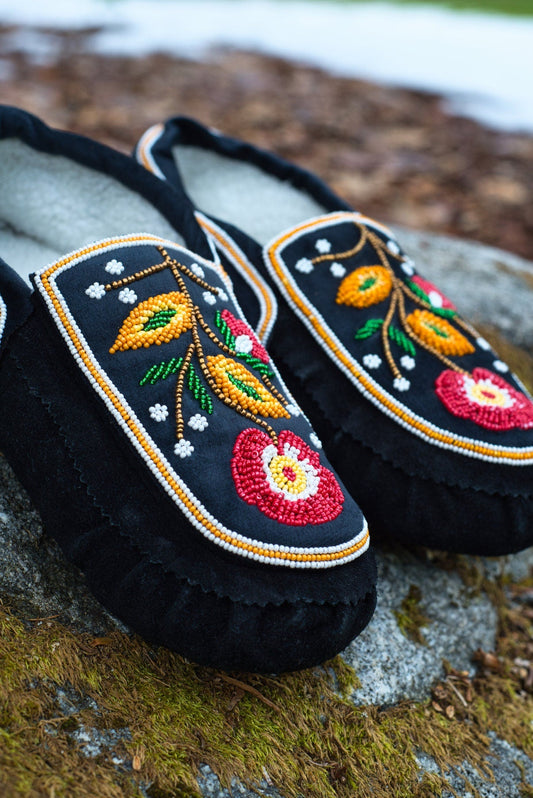 Handcrafted Women's Beaded Moccasins – Genuine Black Suede Leather with Floral Design