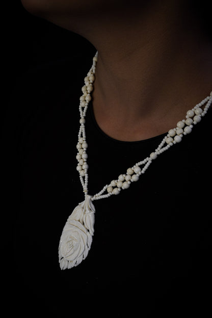 Handcrafted with precision and passion, this exquisite necklace is a testament to the artistry of bone carving. Each delicate detail is meticulously etched into the surface of the bone, creating an intricate pattern that captivates the eye.