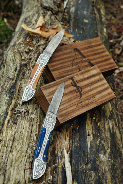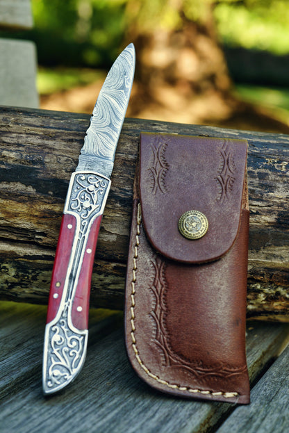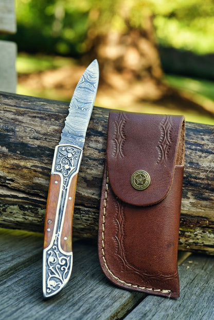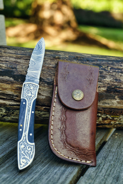 A masterpiece of craftsmanship designed for those who value both functionality and intricate detail. Featuring a beautifully patterned Damascus steel blade, this folding knife combines strength with a unique aesthetic appeal. The handle is crafted with ornate metal inlays and is available in a range of rich colors, allowing you to choose the perfect style to suit your taste.