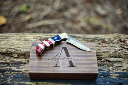 Nice little knife and box. Thought the box and knife would be engraved but just the box is. Doesn't fit in box when in leather pouch