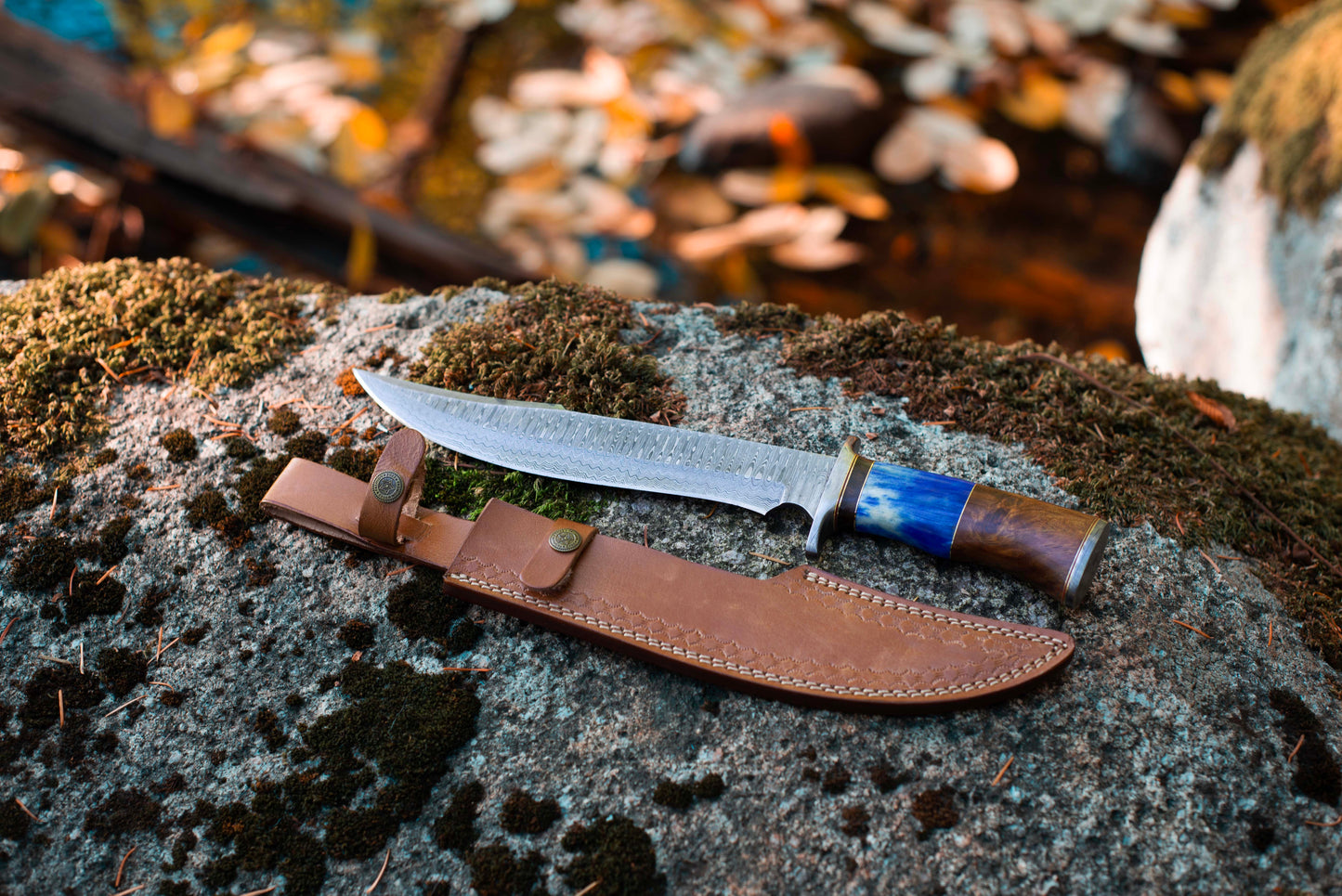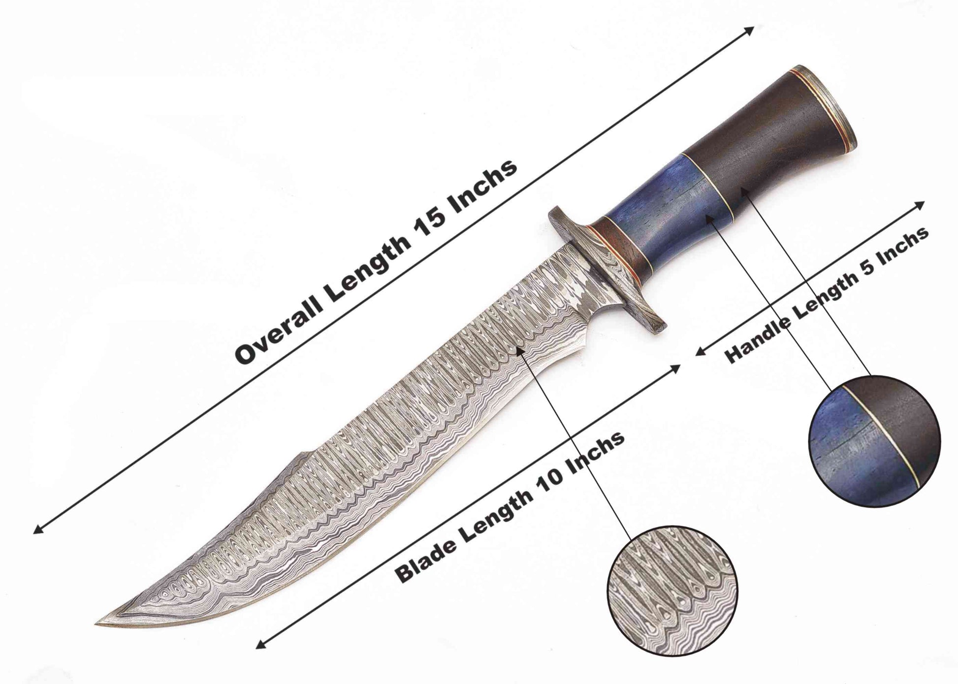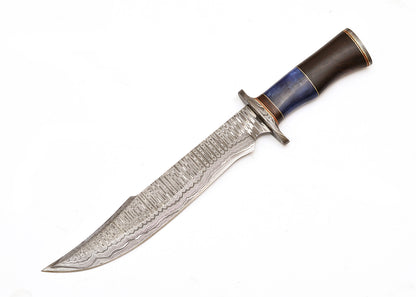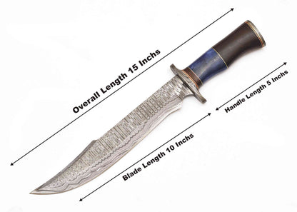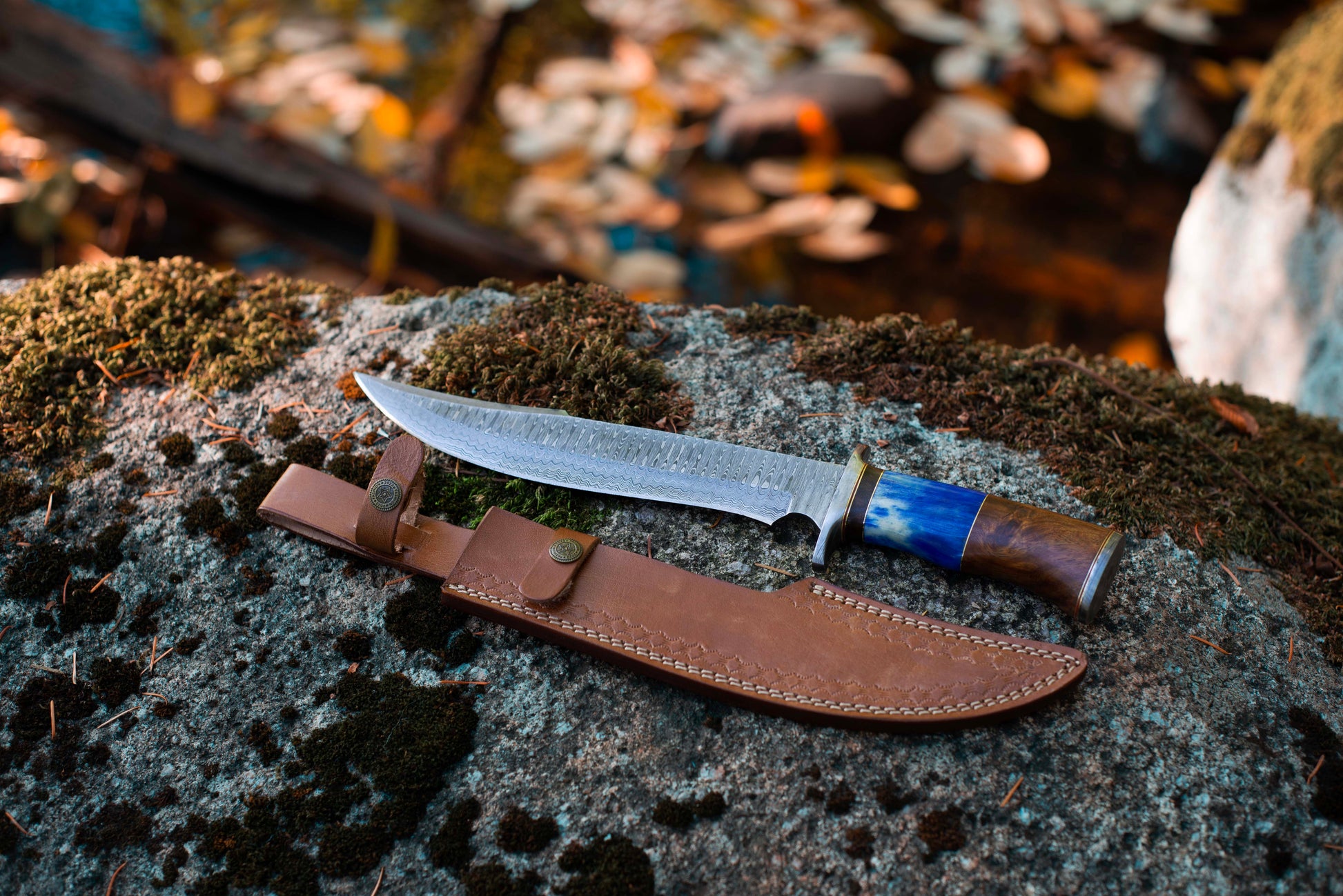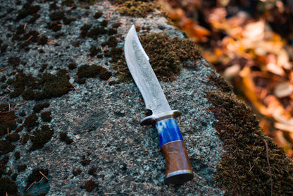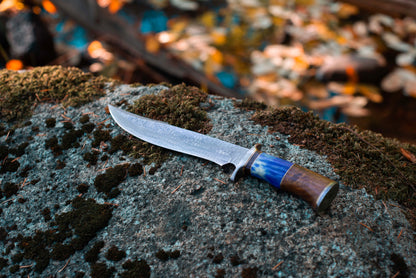 Experience the perfect fusion of artistry and strength with this knife. The blade, forged from 100% Damascus steel, delivers exceptional sharpness and durability, ideal for cutting through tough materials in hunting or outdoor adventures. The handle features a striking combination of blue-stained camel bone and rich wood, designed for a comfortable and secure grip that enhances control.