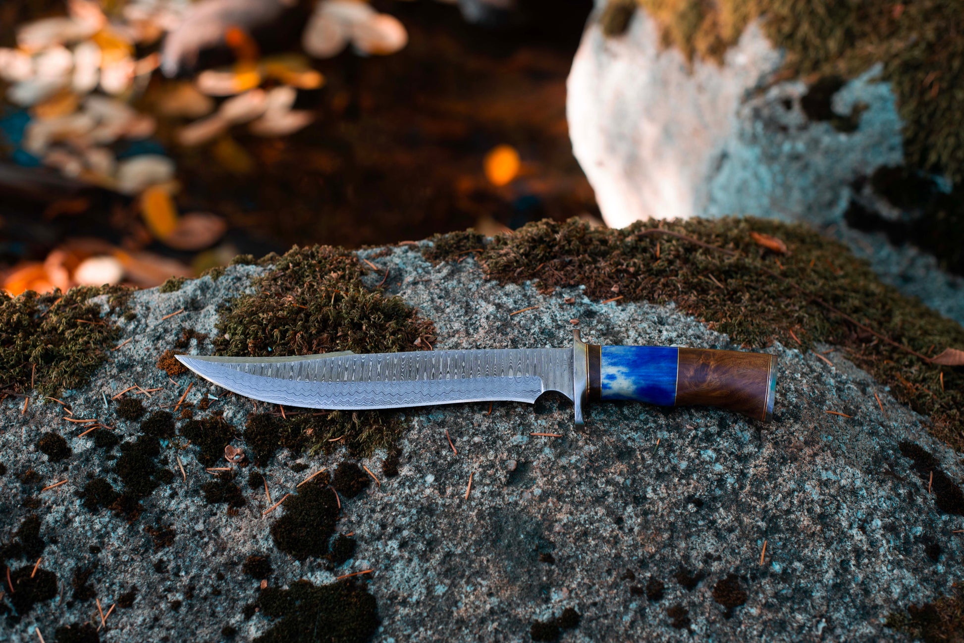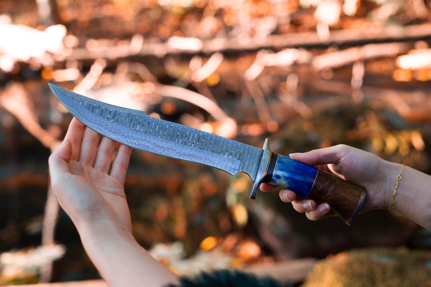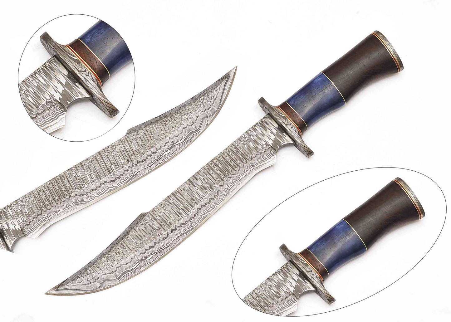 Experience the perfect fusion of artistry and strength with this knife. The blade, forged from 100% Damascus steel, delivers exceptional sharpness and durability, ideal for cutting through tough materials in hunting or outdoor adventures. The handle features a striking combination of blue-stained camel bone and rich wood, designed for a comfortable and secure grip that enhances control.