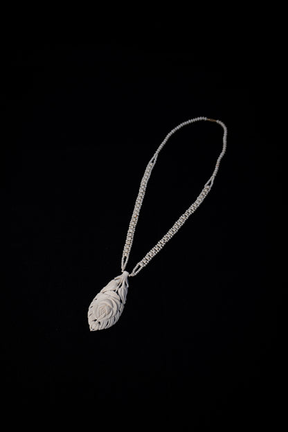 The centerpiece of this stunning necklace is a carefully carved bone pendant, designed to evoke a sense of timeless elegance. The smooth curves and subtle texture of the bone create a striking contrast, drawing attention to the intricate motifs that adorn its surface.