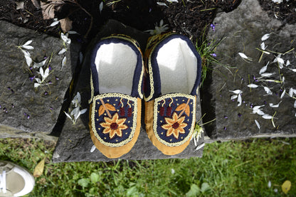 Step into timeless craftsmanship with these leather handmade moccasins, adorned with exquisite sun flower beadwork. Designed by OnlyViking, they blend natural elegance with exceptional comfort. Perfect for those who value artisanal quality and a distinctive touch of style.