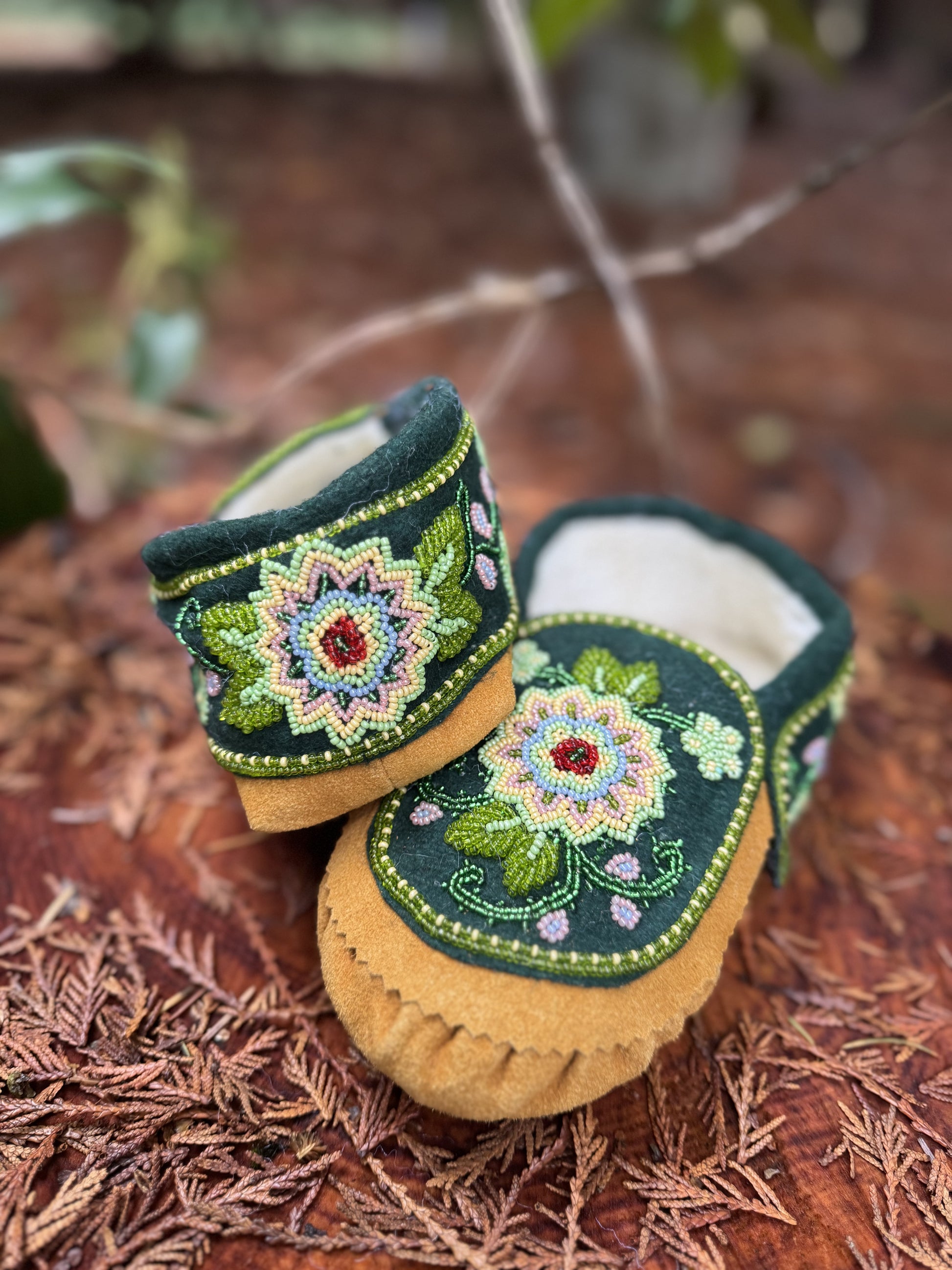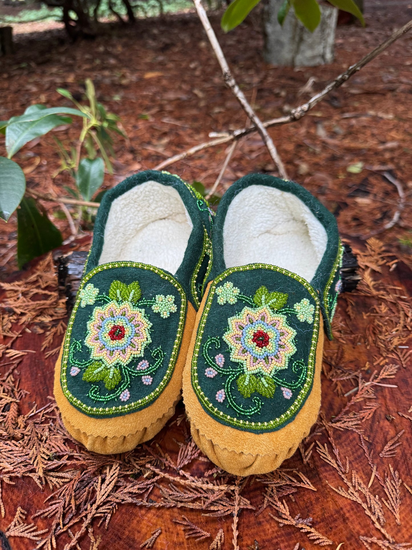 Each pair is thoughtfully handmade by skilled artisans, with hours devoted to creating the detailed beadwork and ensuring precise construction. These moccasins are more than just slippers—they're a statement of quality and care.