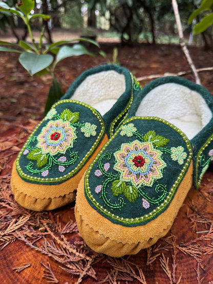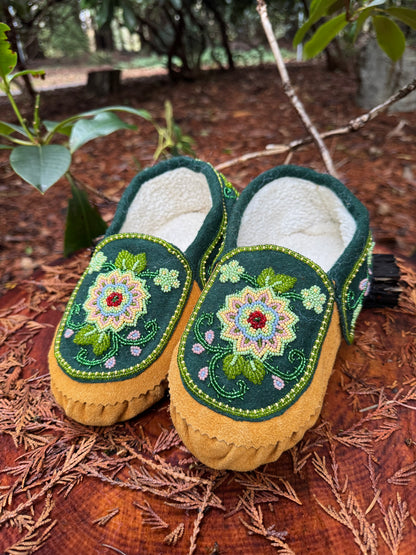 Indulge in comfort and craftsmanship with these beautifully handcrafted indoor beaded moccasins made of tan leather with green base. Featuring intricate floral beadwork, each pair is a work of art that brings elegance and tradition into your home.