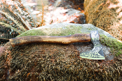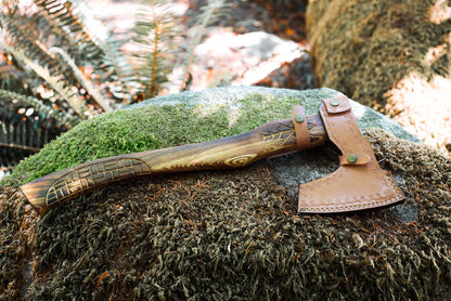 Features: Handcrafted to perfection, each detail speaks of quality craftsmanship and enduring style. The blade features a Permanent Viking Style Engraving, ensuring it remains a timeless piece for generations to come. For added convenience, a premium Leather Sheath is included, ensuring your axe is always protected.
