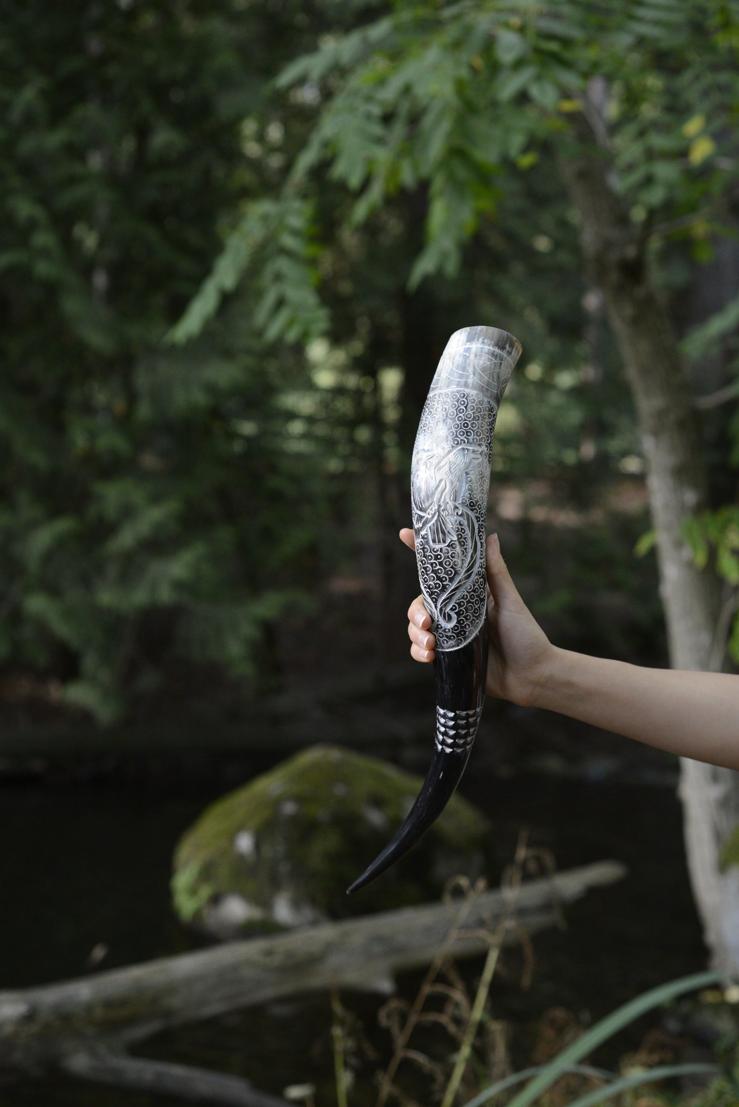Prepare to be captivated by the allure of our hand-carved Viking Ship and Raven Drinking Horns, a true testament to craftsmanship and authenticity. These are not your ordinary drinking horns!