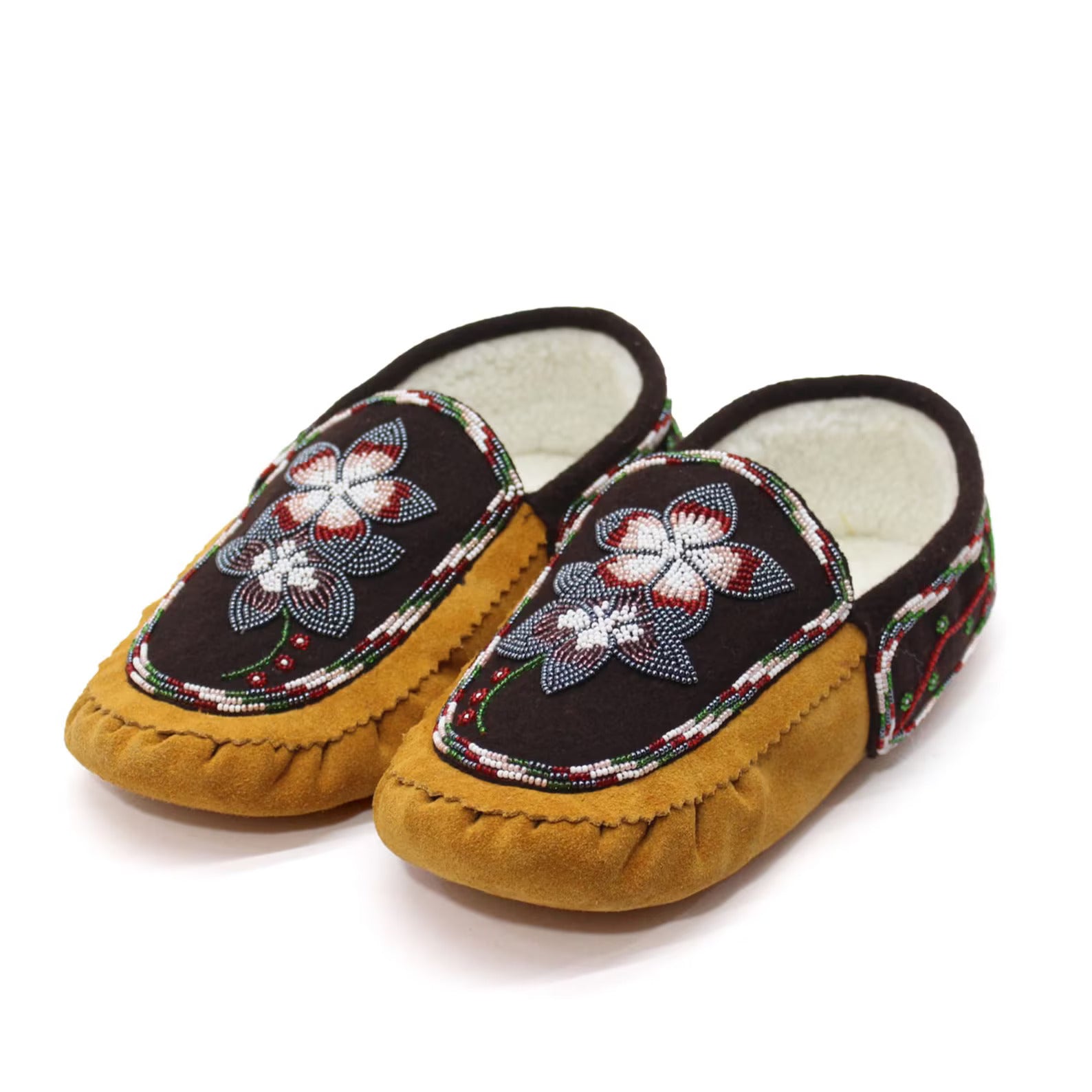 Discover the charm of  beaded moccasins, crafted with genuine leather in a rich brown hue. Featuring intricate bead-work, these moccasins blend traditional artistry with modern comfort. Perfect for those seeking unique, stylish, and durable footwear.