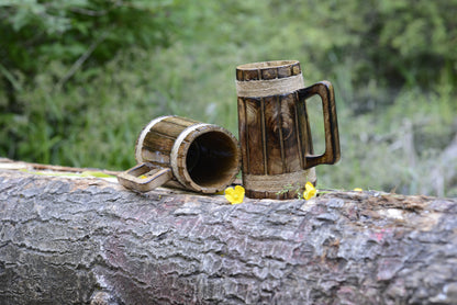 The tankard's body is skillfully carved and shaped from a solid block of wood, typically with a warm and natural tone. The wood is carefully selected for its durability and grain patterns, ensuring that each tankard has its own unique character. The exterior of the tankard is meticulously sanded and polished to a smooth finish, highlighting the natural beauty of the wood.